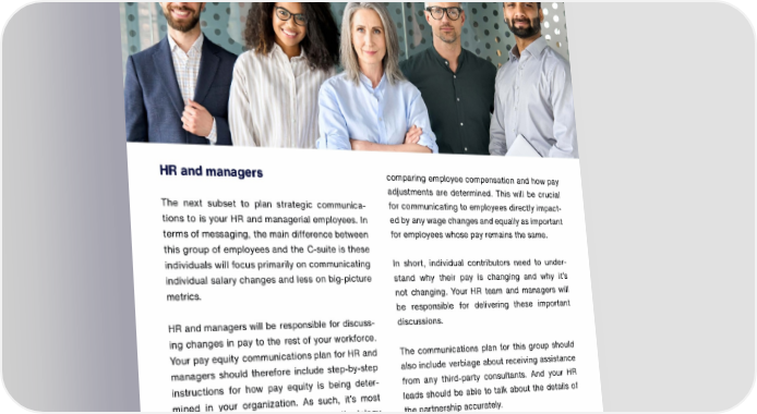 TRUSAIC HR and managers comparing employee compensation and how pay adjustments are determined. This will be crucial The next subset to plan strategic communica for communicating to employees directly impact tions to is your HR and managerial employees. In ed by any wage changes and equally as important terms of messaging, the main difference between for employees whose pay remains the same. this group of employees and the C-suite is these individuals will focus primarily on communicating In short, individual contributors need to under individual salary changes and less on big-picture stand why their pay is changing and why it's metrics. not changing. Your HR team and managers will be responsible for delivering these important HR and managers will be responsible for discuss discussions. ing changes in pay to the rest of your workforce. Your pay equity communications plan for HR and The communications plan for this group should managers should therefore include step-by-step also include verbiage about receiving assistance instructions for how pay equity is being deter from any third-party consultants. And your HR mined in your organization. As such, it's most leads should be able to talk about the details of beneficial to educate them on the methodology the partnership accurately. used for identifying pay inequity and remediating it when found. In developing your communications plan for HR and managers, consider providing them with Pay equity methodology includes the wage in various resources to assist them in talking about fluencing factors your organization takes into compensation with the remainder of your work account when paying employees differently. It force. Speaker prompts, FAQs, guides, and talking also includes how groupings are constructed for points could all be of immense value to this group.