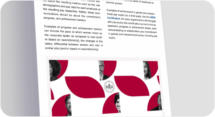 TRUSAIC On the other hand, moving away from resulting Examples of commitment, to corroborate a mes metrics, if you announce to your employees the sage of commitment, include expansion of the metrics associated with the process, such as your talent acquisition to focus on more racially diverse commitment, progress and achievement, the risk schools and the implementation of employee re is managed. These communicated metrics are sources groups. not about the resulting metrics such as the raw demographics and pay data for each employee or Examples of achievement in gender and intersec the resulting pay disparities. Rather, these com tional pay equity by a third party, like the EDGE munications should be about the commitment, Certification. As many organizations still struggle progress, and achievement metrics. with pay equity, this certification can be for the as sessment, progress or achievement phase, each Examples of progress and achievement metrics demonstrating to stakeholders your commitment can include the pace at which women move up in gender and intersectional equity, including pay the corporate ladder as compared to men (and/ equity. or based on race/ethnicity), the changes in the salary differential between women and men in similar jobs (and/or based on race/ethnicity). Transform Your Workforce: Measure, Accelerate & Get Certified in Gender & lntersectional Equity.