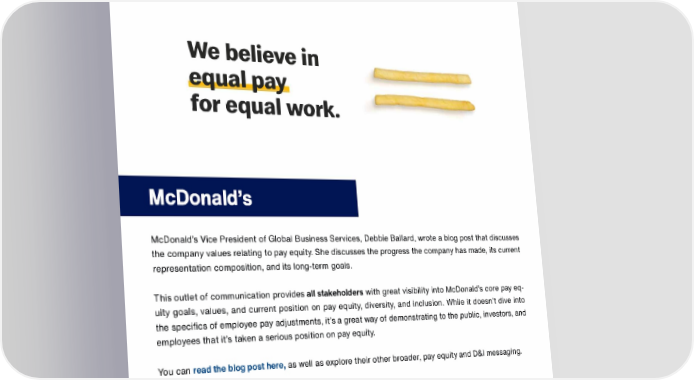 TRUSAIC Sc...ch Q m Out Company v Our Purpose &-Impact v Our Stones v ll"IYGCtOtS v We believe in egualP-aJ for equal work. McDonald's McDonald's Vice President of Global Business Services, Debbie Ballard, wrote a blog post that discusses the company values relating to pay equity. She discusses the progress the company has made, its current representation composition, and its long-term goals. This outlet of communication provides all stakeholders with great visibility into McDonald's core pay eq uity goals, values, and current position on pay equity, diversity, and inclusion. While it doesn't dive into the specifics of employee pay adjustments, it's a great way of demonstrating to the public, investors, and employees that it's taken a serious position on pay equity. You can read the blog post here, as well as explore their other broader, pay equity and D&I messaging.