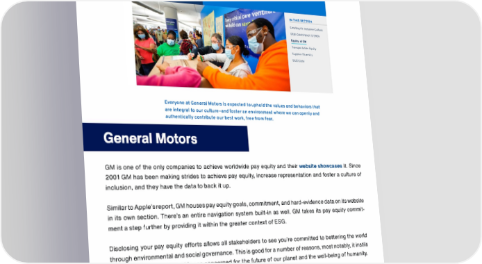 TRUSAIC general motors u.t•L1nt1r LL»' �WI ll►U :,.1.::.t1 UP,.�(. UN!>UC... Lont.ct ESG ESG MATERIAL OOWNLOAOS ESG·RELATEO MANAGCMCNT GOVCRNANCC TOPICS &ARCHIVC POLICICS IN THIS SECTION Creabng An lnclus,ve Culture DE&I Governance & ERGS Equity •I GM Transportation Equity Suppli,.r Div1tr1ity l>l&I IJ.:Jta Everyone at General Motors is expected to uphold the values and behaviors that are integral to our culture-and foster an environment where we can openly and authentically contribute our best work, free from fear. General Motors GM is one of the only companies to achieve worldwide pay equity and their website showcases it. Since 2001 GM has been making strides to achieve pay equity, increase representation and foster a culture of inclusion, and they have the data to back it up. Similar to Apple's report, GM houses pay equity goals, commitment, and hard-evidence data on its website in its own section. There's an entire navigation system built-in as well. GM takes its pay equity commit ment a step further by providing it within the greater context of ESG. Disclosing your pay equity efforts allows all stakeholders to see you're committed to bettering the world through environmental and social governance. This is good for a number of reasons, most notably, it instils confidence that your brand is one concerned for the future of our planet and the well-being of humanity. Choosing to share its pay equity and DEi information this way is also great for demonstrating progress to investors, governing bodies, shareholders, and the general public.