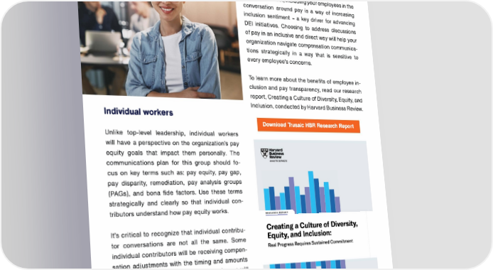 TRUSAIC Employees should be encouraged to talk about pay if they are interested in doing so. Pay trans parency can facilitate a positive, open work en vironment. In fact, including your employees in the conversation around pay is a way of increasing inclusion sentiment - a key driver for advancing DEi initiatives. Choosing to address discussions of pay in an inclusive and direct way will help your organization navigate compensation communica tions strategically in a way that is sensitive to every employee's concerns. To learn more about the benefits of employee in clusion and pay transparency, read our research report, Creating a Culture of Diversity, Equity, and Inclusion, conducted by Harvard Business Review. Individual workers Download Trusaic HBR Research Report Unlike top-level leadership, individual workers will have a perspective on the organization's pay equity goals that impact them personally. The AHM.nlt SUMCQ communications plan for this group should fo cus on key terms such as: pay equity, pay gap, pay disparity, remediation, pay analysis groups (PAGs), and bona fide factors. Use these terms strategically and clearly so that individual con tributors understand how pay equity works. Creating a Culture of Diversity, It's critical to recognize that individual contribu Equity, and Inclusion: tor conversations are not all the same. Some Real Progress Requires Sustained Commitment individual contributors will be receiving compen sation adjustments with the timing and amounts potentially varying, and still other employees will not receive any adjustments. These various individual worker groups should understand the elements of a pay equity analysis and the importance of wage influencing factors _.,. TRUSAIC 1§11111) as they apply to your organization to eliminate or minimize apparent pay gaps.