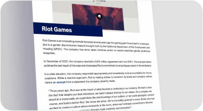 TRUSAIC cm Riot Games Reaches 0 Global Settlement Agreement Riot Games is an interesting example because several years ago the gaming giant found itself in a bad spot, due to a gender discrimination lawsuit brought forth by the California Department of Fair Employment and Housing (DFEH). The company has since taken immense action to resolve identified gender workforce inequities. In December of 2021, the company reached a $100 million agreement with the DFEH. The example below outlines the end result of the case and showcases Riot's commitment to ensuring pay equity in the workplace. In a crisis situation, the company responded appropriately and immediately took accountability for the acĀ cusations. While a reactive approach, Riot is making strides to transform its brand and company culture. Here's an excerpt from a statement the company recently made: "Three years ago, Riot was at the heart of what became a reckoning in our industry. We had to face the fact that despite our best intentions, we hadn't always lived up to our values. As a company we stood at a crossroads; we could deny the shortcomings of our culture, or we could apologize, correct course, and build a better Riot. We chose the latter. We're incredibly grateful to every Rioter who has worked to create a culture where inclusivity is the norm, where we're deeply committed to fairness and equality, and where embracing diversity fuels creativity and innovation." To be clear, Riot is not yet a leading example of how to approach pay equity, diversity, and inclusion within the workplace. The nature of their case called for a complete transformation of the company culture and workplace policies. Rather, they're an example of how to respond to an extreme crisis situation regarding pay equity and DEi. Riot demonstrates how organizations can right a wrong. DISCLAIMER: The Pay Equity Communications Planner was created using internal expertise and publicly available pay equity information. Named organizations do not imply a relationship with Trusaic.
