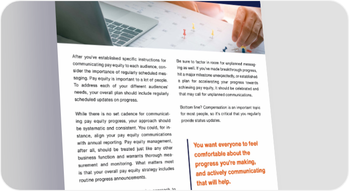 TRUSAIC f After you've established specific instructions for Be sure to factor in room for unplanned messag communicating pay equity to each audience, con ing as well. If you've made breakthrough progress, sider the importance of regularly scheduled mes hit a major milestone unexpectedly, or established saging. Pay equity is important to a lot of people. a plan for accelerating your progress towards To address each of your different audiences' achieving pay equity, it should be celebrated and needs, your overall plan should include regularly that may call for unplanned communications. scheduled updates on progress. Bottom line? Compensation is an important topic While there is no set cadence for communicat for most people, so it's critical that you regularly ing pay equity progress, your approach should provide status updates. be systematic and consistent. You could, for in stance, align your pay equity communications with annual reporting. Pay equity management, You want everyone to feel after all, should be treated just like any other business function and warrants thorough mea comfortable about the surement and monitoring. What matters most progress you're making, is that your overall pay equity strategy includes routine progress announcements. and actively communicating that will help. If you're taking a more aggressive approach to achieve pay equity, meaning you're trying to get there as quickly as possible, it would be best to announce communications on a more frequent basis. Work with the necessary stakeholders to de velop a schedule that works for your organization.