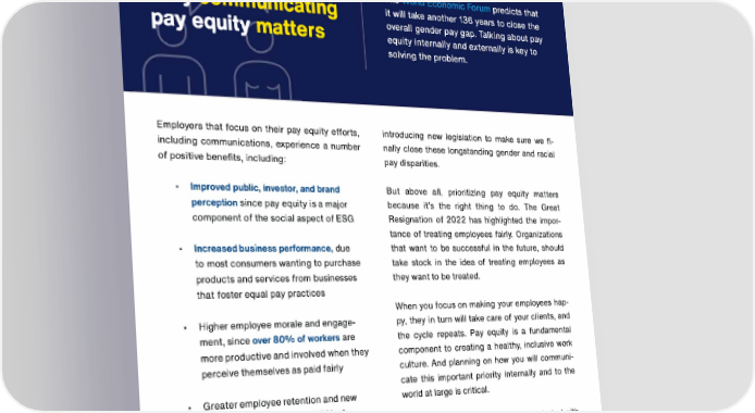 TRUSAIC The predicts that it will take another 136 years to close the Why communicating overall gender pay gap. Talking about pay pay equity matters equity internally and externally is key to solving the problem. Employers that focus on their pay equity efforts, introducing new legislation to make sure we fi including communications, experience a number nally close these longstanding gender and racial of positive benefits, including: pay disparities. Improved public, investor, and brand But above all, prioritizing pay equity matters perception since pay equity is a major because it's the right thing to do. The Great component of the social aspect of ESG Resignation of 2022 has highlighted the impor tance of treating employees fairly. Organizations Increased business performance, due that want to be successful in the future, should to most consumers wanting to purchase take stock in the idea of treating employees as products and services from businesses they want to be treated. that foster equal pay practices When you focus on making your employees hap Higher employee morale and engage py, they in turn will take care of your clients, and ment, since over 80% of workers are the cycle repeats. Pay equity is a fundamental more productive and involved when they component to creating a healthy, inclusive work perceive themselves as paid fairly culture. And planning on how you will communi cate this important priority internally and to the Greater employee retention and new world at large is critical. talent attraction because 75% of employees are more likely to apply for a Without further ado, it's time to get started with job that promotes pay transparency your pay equity communications plan. In addition to the many benefits associated with pay equity, it's also the law of the land in many countries worldwide. To further drive social good, states, localities, and entire regions are